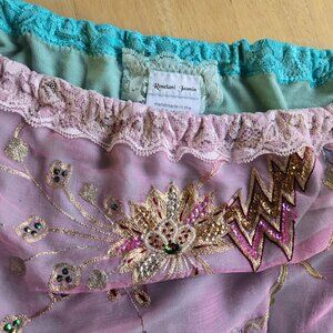 Step into romantic elegance with this enchanting 3 piece strapless tube top, crushed velvet rose brooch and waist sash. The top features delicate vintage embroidered chiffon in soft aqua and blush tones layered over stretchy minty-sage green fabric. The elasticized bust and waist makes this easy to wear, and with a handmade waist sash embellished with precious vintage and antique embroidery snippets—tie it into a graceful back bow in the back. A removable handcrafted satin and velvet rose brooch completes the look.