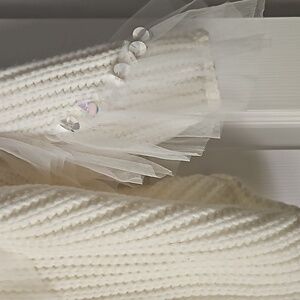 *size S/M, relaxed-fit. cream color knit, white tulle w/ multi-colored decoration