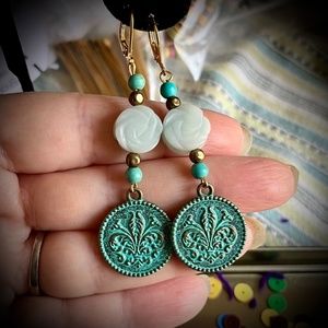 These are a one-of-a-kind (OOAK) pair of earrings made with carved floral Amazonite beads, turquoise & and brass beads from an old necklace, and patina dangles.
