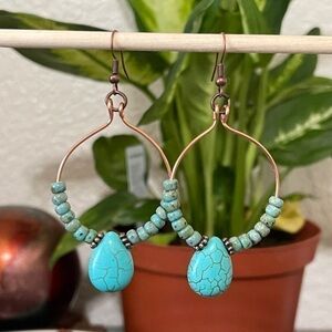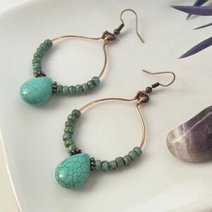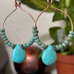 These large hoop earrings are handmade with turquoise magnesite stones, glass seed beads and copp measure approximately 1 3/4 inches wide and 2 3/4 inches long top to bottom.