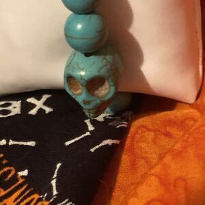 Add some edge to your accessory collection with this handmade skull bracelet. The unique piece features a stunning turquoise resin design with accent beads that will make a statement no matter how you choose to wear it. The bracelet is crafted with care and attention to detail, making it a standout addition to any collection.