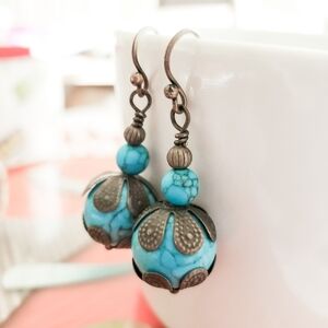 Beautifully and Uniquely Handcrafted this pair of gorgeous and charming earrings is set in Polymer Clay Faux Turquoise 20mm Beads made by myself and Real Natural 5mm Turquoise round beads all together on a Hand darkened Brass wire.