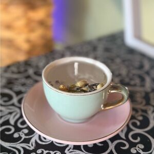 Charming turquoise teacup candle paired with amethyst crystals and dried flowers. Perfect for relaxation and healing.