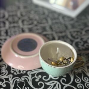 Handmade Turquoise Teacup Gel Wax Candle with Amethyst Crystals & Dried Flowers