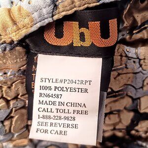 Solid deep blue on one side and abstract print in slate blue grey and tan on the other side.