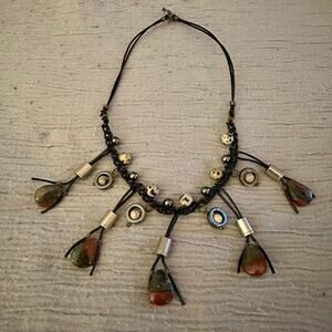 Design: The necklace is intricately braided with black cord and adorned with a variety of natural stones, silver-tone beads, and dangling pendants.