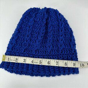 Hand-knit unisex warm and cozy beanie fits most Adult Small - Medium sizes, royal blue color, stretchy, easy care, soft, and can be worn rolled up or down. Care machine wash cold lay flat to dry. Material acrylic yarn. Condition is new never worn. Please preview measurements to ensure fit. This was hand-knit in San Jose by an artist with a passion and talent for creating quality beanies, sweaters, scarfs and dog sweaters.