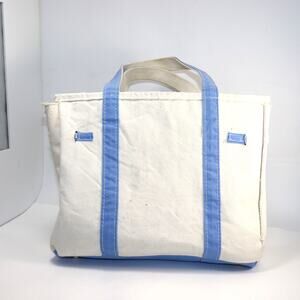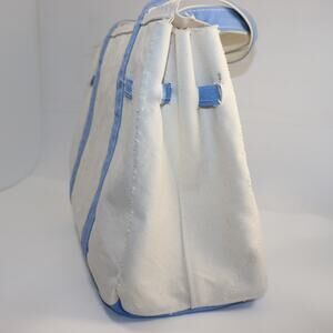 Brand new handmade tote bag crafted by me using upcycled canvas tote materials. Inspired by the iconic Boat and Tote style, this piece features sturdy off-white canvas, blue trim, and raw, exposed stitching for a deconstructed look. Silver-tone buckle strap closure on top.