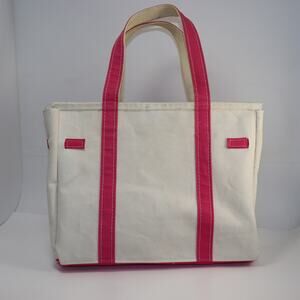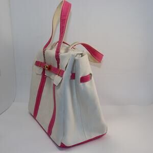 Brand new handmade tote bag crafted by me using upcycled canvas tote materials. Inspired by the iconic Boat and Tote style, this piece features sturdy off-white canvas, pink trim, and raw, exposed stitching for a deconstructed look. Silver-tone buckle strap closure on top.