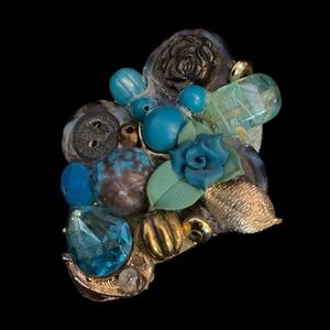 This is an up-cycled hand crafted brooch made with repurposed vintage jewelry, beads and buttons in blues and silver. It fastens to clothing with a bar pin. Made in 1995 in the San Francisco Bay Area. Titled "Ocean Inspiration".