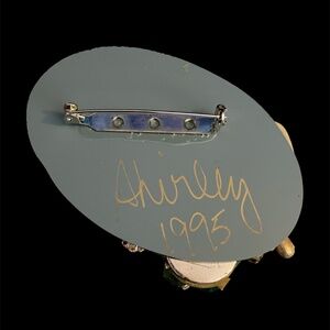 This is an up-cycled hand crafted brooch made with repurposed vintage jewelry and beads in greens and gold. It fastens to clothing with a bar pin. Made in 1995 in the San Francisco Bay Area. It measures 3". Adorned with roses and hearts. Titled "Harmony".