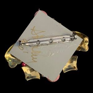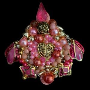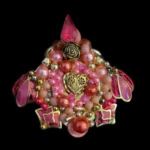 This is an up-cycled hand crafted brooch made with repurposed vintage jewelry and beads in pinks and gold. It fastens to clothing with a bar pin. Made in 1995 in the San Francisco Bay Area. It measures 2 ¼". Titled "Love Blooms".