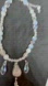 This is a unique handmade choker-style necklace featuring a central natural stone, likely rose quartz, wrapped in wire. The necklace is crafted with a mix of new and upcycled components, including plastic and glass beads, with beautiful iridescent teardrop-shaped accents that catch the light elegantly. The soft pastel tones and subtle shimmer make it perfect for both everyday wear and special occasions. The adjustable chain allows for a customizable fit.