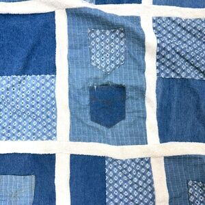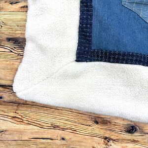 Quirky and fun upcycled denim jean patchwork throw blanket. Back pocket accents- fun place to keep snacks while watching a movie. Fleece sherpa boarders. Solid soft denim back.