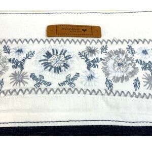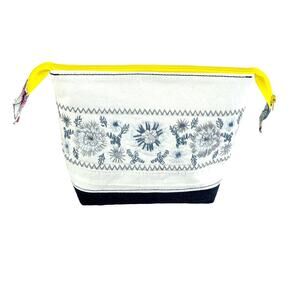 Handmade Upcycled Floral Embroidered White Denim Lined Cosmetic Pouch Bag