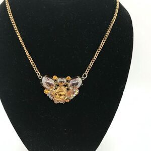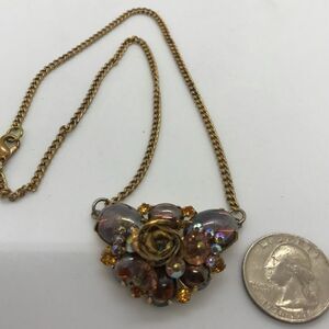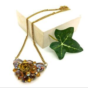 The centerpiece is a rhinestone pendant with a gold rose. A vintage chain is attached on either side.