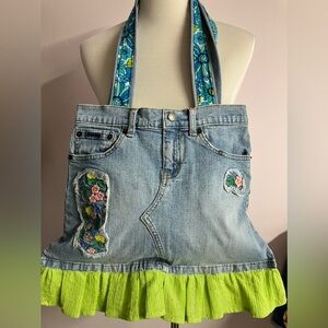 Handmade Upcycled Shoulder/Tote Bag, Blue/Green, Embroidered