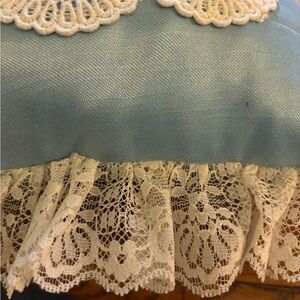 Handmade VTG Victorian Pillow Blue Cross-Stitch Doll Teddy Kitty Lace Trim
