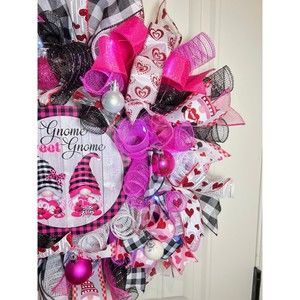 About 22 inches, 6 inch-deep door or mantle wreath. Pink, black & White mesh back. Valentines themed w/ vibrant colored wired ribbons (9 styles). A “Gnome Sweet Gnome” sign and ball ornaments adorn this wreath.