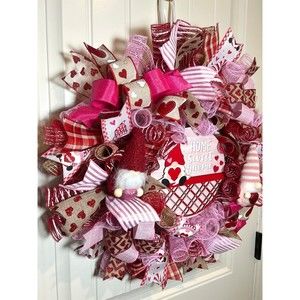 About 22 inches, 6 inch-deep door or mantle wreath. Red, Pink & burlap mesh back. Valentines themed w/ vibrant colored wired ribbons (9 styles). A “Home Sweet Gnome” gnome sign and two plush heart holding gnomes adorn this wreath.
