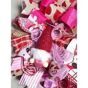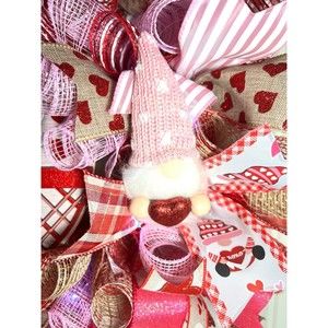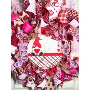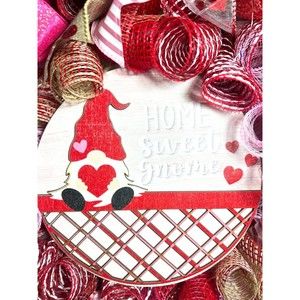 About 22 inches, 6 inch-deep door or mantle wreath. Red, Pink & burlap mesh back. Valentines themed w/ vibrant colored wired ribbons (9 styles). A “Home Sweet Gnome” gnome sign and two plush heart holding gnomes adorn this wreath.