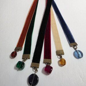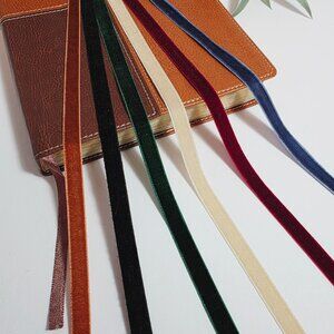 Beautifully handcrafted, this velvet ribbon Bible bookmark is both elegant and functional. Featuring rich jewel-tone velvet ribbons in earthy fall shades—rust, forest green, black, burgundy, navy, and cream—each ribbon is tipped with a glass bead in coordinating colors. The ribbons are attached to an antique bronze ring and topped with a hand-sewn faux green embossed leather tab for a sophisticated finish.