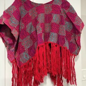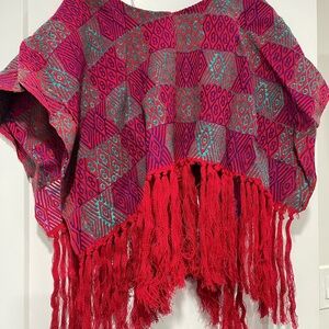 Colorful poncho featuring a geometric pattern in red and purple. Accented with fringe detailing.