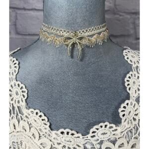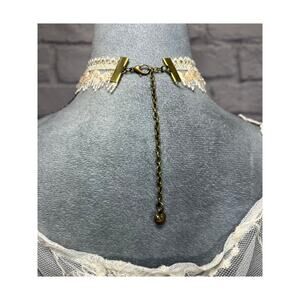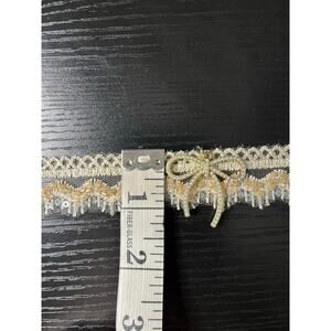 This gorgeous little choker has a vintage, coquette aesthetic with soft pastel feminine colors. It was carefully crafted with beautiful beaded lace and features a delicate pearl beaded bow pendant detail in the front.