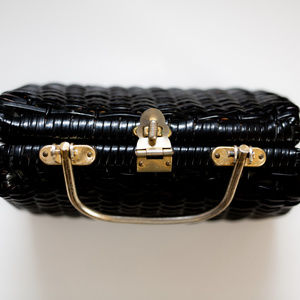 One of A kind! Gorgeous woman in black basket bag. When opened, has a vibrant pop delicious orange color. Gold hardware