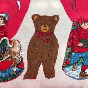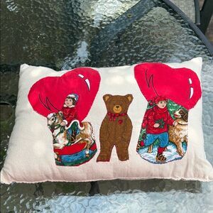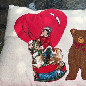 Handmade vintage Decorative pillow with heart and bear. Features vibrant red and brown colors.