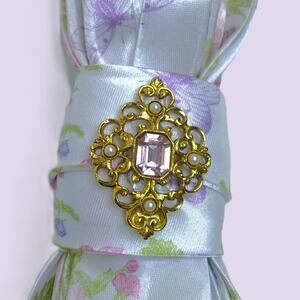 This upcycled piece is brand new, offering a unique and sustainable fashion statement. The romantic pastel tones provides a whimsical floral butterfly backdrop for the dazzling center piece, creating a one-of-a-kind accessory that's sure to get noticed.