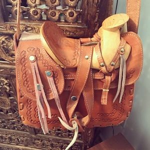 🐎 👜 This is seriously THE COOLEST handbag I have every ran across!! Obsessed with the handmade quality and unique vibe. Retro, funky and functional. Beautiful tooled leather and real wood pieces mimic a horse saddle. The details are amazing... all the way down to the little stirrups.
