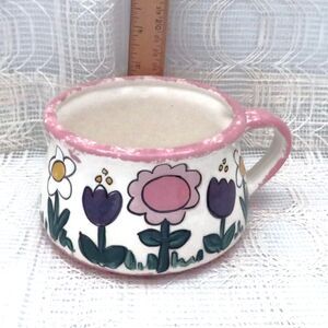 Enjoy your cup of soup with this vintage handpainted, handmade ceramic soup cup. This white soup mug features pink trim on the top, bottom, and handle along with flowers in pink, purple, and white.
