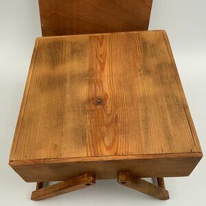 This is a vintage handmade sewing box made of wood, measuring 11 inches in length, 11 inches in width, and 3 3/4 inches in height. It features a hand-painted cover with a folk-art design. The box is designed for carrying sewing supplies and is a unique piece of collectible art from the time period of 1930 to now.