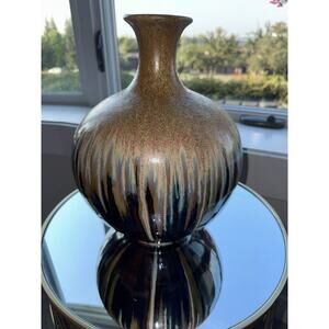 This stunning handmade vintage pottery vase is a true masterpiece. With a beautiful burgundy blue cream color and a unique drip glaze, this vase is sure to add a touch of elegance to any room. Measuring 12 inches in height, it is perfect for displaying flowers or as a standalone decorative piece.