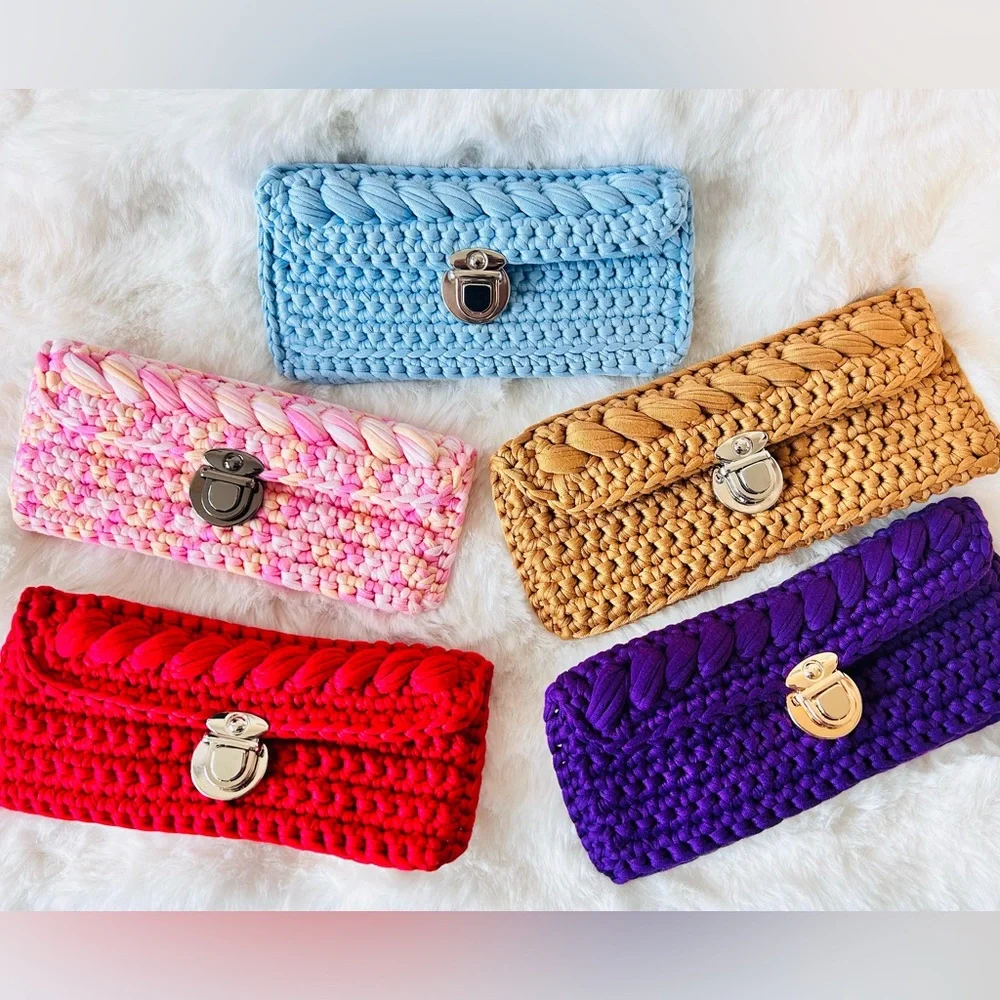 This elegant handmade crochet wallet is a timeless accessory designed for style and functionality. Featuring a sophisticated puff stitch flap, a secure push-lock clasp, and a sleek, compact design, this wallet is perfect for carrying your essentials like, cash, cards, etc. with ease.