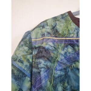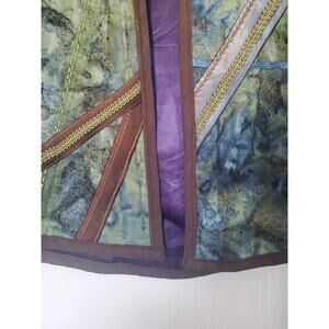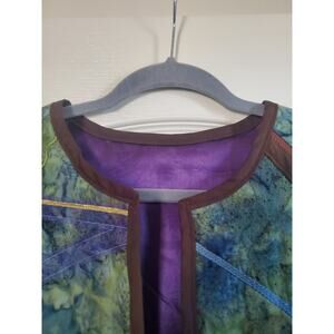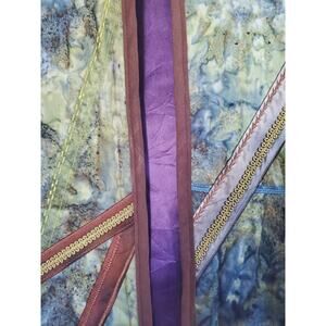 Style: Artsy lined short watercolor jacket. Feels like cotton with no stretch. Embellished with ribbons and embroidery throughout. Extra long sleeves that can be rolled. Open, no closure. Moderate weight. Curved hemline for a flattering fit. Contrasting hem. Fully lined. Good Quality. Assumed hand wash only.