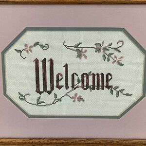 Handmade Welcome Cross-Stitch Framed In Oak Wood With Pink Matte Accent