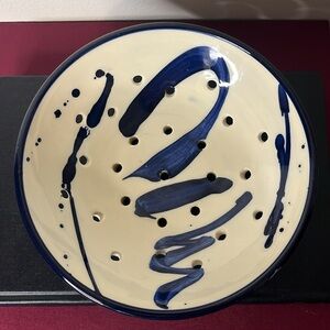 Handmade White & Blue Brush Stroke Signed Ceramic Vintage Berry Bowl Strainer