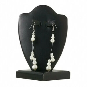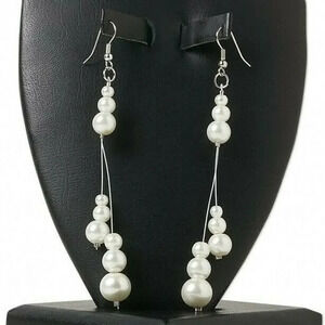 Handmade White Graduated Glass Pearl Triple Dangle 4" Long Dangle Earrings