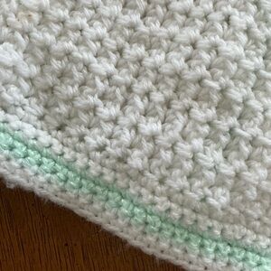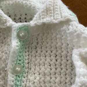 Cozy handmade crochet cardigan in white with green accents. Features button closure and long sleeves.prefect baby gift never used.