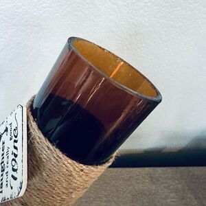 Handmade wine bottle decor vase with rustic twine wrap and wooden sign: “This home runs on love, laughter, and really good wine.” Can also be used as a lamp with some battery powered fairy lights inside (not included). Cut bottom as shown.