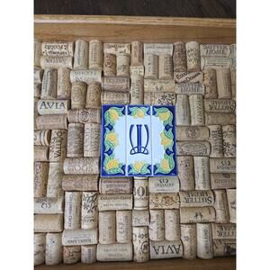 Materials: Real wine corks, wood frame, ceramic tile inlay, metal side handles