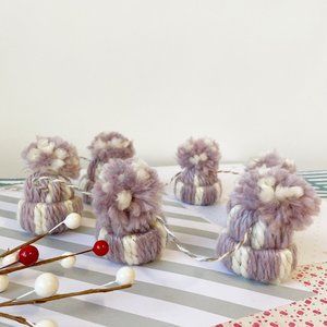 Each garland features a set of 6 mini beanie knit winter hats made from colorful wool blend yarn in a gorgeous neutral lilac, cream, gold, pink color palette.