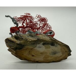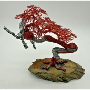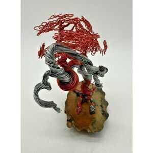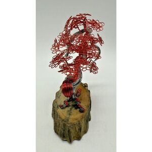 Handmade Wire Bonsai Tree Sculpture Art Red Silver Metal Modern Decor Wood Base
