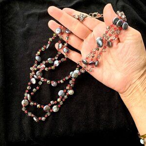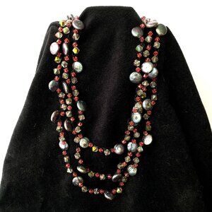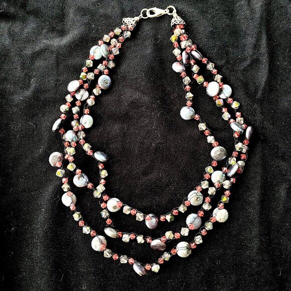 Exciting Handmade Black Wire Metal Crochet Beaded 3-Strand 16 inch to 18 inch Tiered Necklace with Luminous Gray/Blue Coin Pearls, Sparkly Smoky Gray and Salmon Colored Swarovski Crystals. There are Sterling Silver End Caps with a Large Sterling Lobster Claw Clasp.
