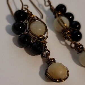 Elegant and artfully handcrafted, these wire wrapped dangle earrings feature a stunning combination of glossy black and creamy white beads. Each earring is uniquely formed with antique bronze wire, creating a warm, vintage-inspired look. The central bead is securely wrapped in an open spiral design, accented by clusters of smaller beads and a single drop bead for movement and charm.