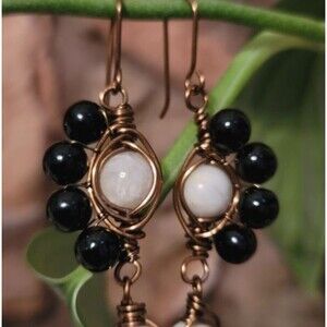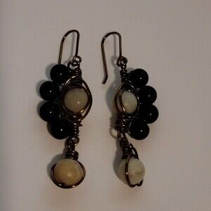 Handmade Wire Wrapped Dangle Earrings – Black & White Beaded Boho Jewelry