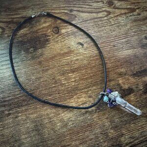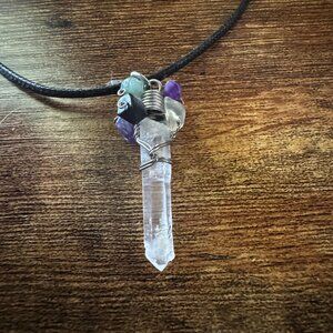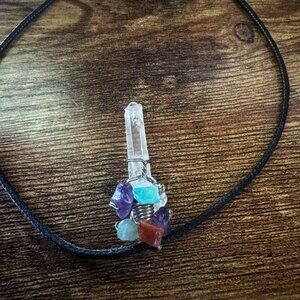 Tap into your spiritual side with this unique, handmade crystal point pendant necklace. Featuring a natural clear quartz point wrapped in silver wire and accented with a cluster of tumbled gemstones including amethyst, aquamarine, obsidian, and carnelian. Strung on a black braided cord with lobster clasp closure for secure wear.