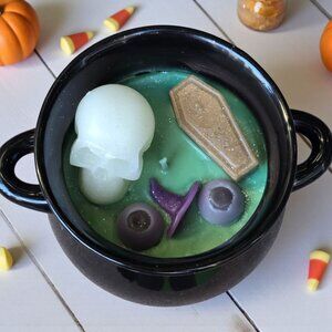 Style Tags: witch cauldron candle ✦ skull candle ✦ Halloween décor ✦ artisan candle ✦ spooky collectible